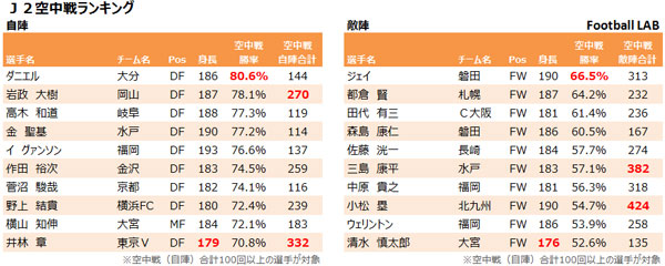 敵陣の勝率でトップに立ったのは、J2の得点王に輝いたジェイ。得点ランキングで3位だった小松塁は、合計数で最多の数字をたたき出した。