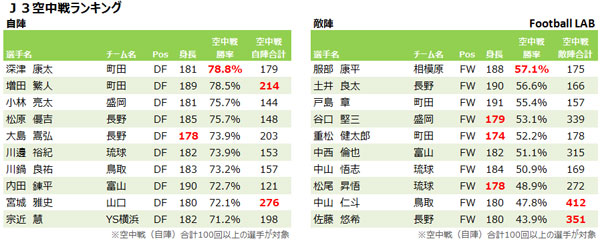 J3で最少失点を誇った町田の深津康太と増田繁人のセンターバックコンビが、自陣の勝率でワンツーフィニッシュを果たした。