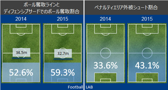 昨季に比べボール奪取位置が下がった今季は、ボール奪取ライン(奪取位置の平均位置)を約2m下げ、ディフェンシブサードでの奪取数割合は約7%上昇。ラインを下げて中央を固めたことで、セットプレーを除くペナルティエリア外からの被シュート割合は10%近く増えた。