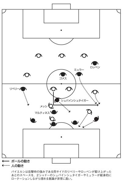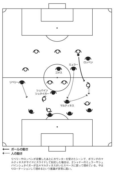 「ボールを奪われた直後には、リベリーやロッベンが駆け上がった背後のスペースに戻らなければいけないのですが、このとき、2シャドーのうちのミュラーがその空けたスペースに戻るようにしている【図2】。あるいは、ボランチのハビ・マルティネスがサイドへスライドしてスペースを埋め、そのマルティネスが元々いたボランチのスペースにミュラーやシュバインシュタイガーが戻って埋めている【図3】。