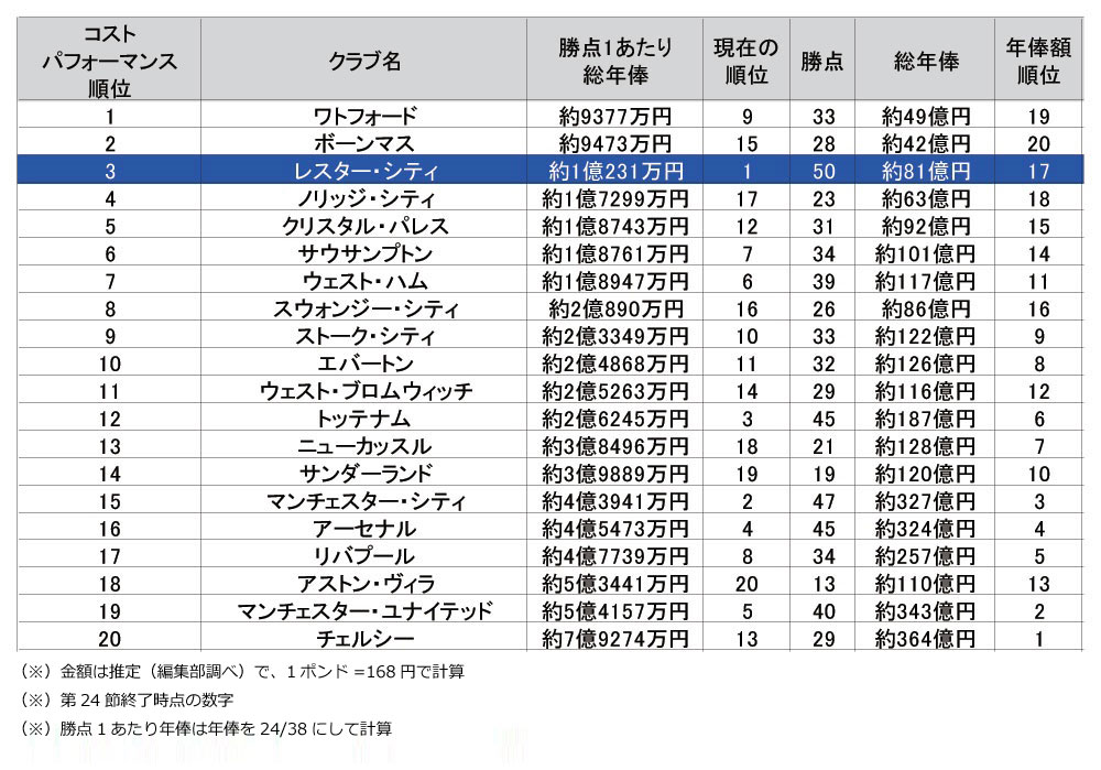 レスターはかなり優秀だが、勝点1あたりのコストパフォーマンスから見れば、ワトフォードとボーンマスが1位と2位を占め、レスターは3位になる。各クラブの総年俸は表の通り。