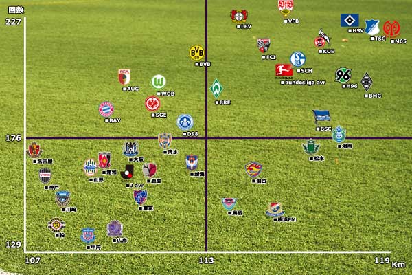 各項目の中央に引かれている十字のラインはそれぞれの平均値を表している。そして、スプリント回数でブンデス勢とJリーグ勢はくっきりと平均以上・以下に分かれている。