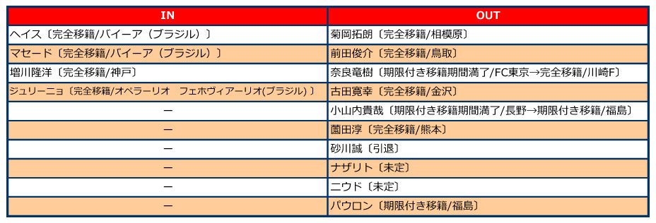 昨季は2年目のバルバリッチ監督をシーズン途中で解任し、U-18を率いていた四方田修平監督を昇格させた。劇的な改善とはならなかったものの、少しずつ目指すスタイルを植え付けていった印象だ。今季は四方田監督体制の継続による“色”の成熟がポイント。余剰気味だった戦力を手放しながら、新外国籍選手と経験豊富な増川隆洋の獲得でピンポイントのチーム力アップを狙う。2年連続で監督を途中解任しているだけに、そろそろ結果が欲しい。