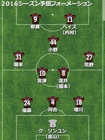 下部組織出身の若手が多く、彼らの成長次第で戦力アップとなる可能性は常にある。一方で、ここ数年は思ったほどの成果を挙げていないことも事実であり、今オフは主力として期待され続けてきた古田寛幸がチームを離れた。現時点での出世頭である荒野拓馬、深井一希、堀米悠斗らを中心に、もう一皮むけていかなければ上位は見えてこないだろう。チームの躍進を演出するような活躍で、U-18時代の彼らを指導した四方田修平監督に恩返しを果たしたい。