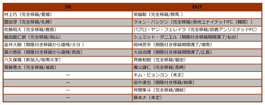 最大の得点源である齊藤和樹が磐田へ移籍し、個人昇格を果たした。昨季12ゴールを奪っただけでなく、最前線からプレスをかけ続ける積極性でもチームを助けていただけに大きな損失となった。