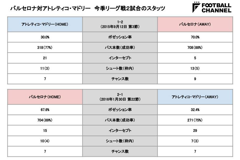 試合は、一言で言ってしまえば「バルサがボールを支配してアトレティコがカウンターを狙う」といった展開が予想される。今季対戦した2試合を、『whoscored.com』および『squawka』のスタッツから分析してみる。