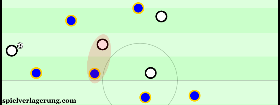 SBがボール保持者を追うとき、一時的に3バックになるが、MFが下がって補完する。(※端末によってはアニメーションが機能しない場合があります)