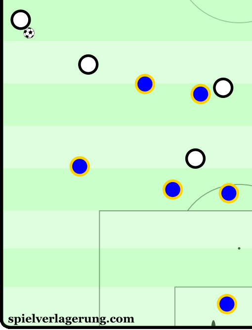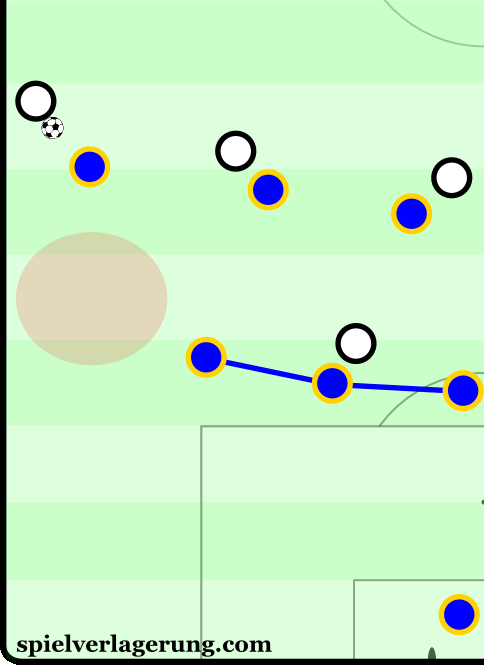 対戦相手がサイドに移動したら、センターFWによるプレッシングのおかげで、レスターのブロックの周りでボールを動かすことが難しくなる。MFたちはしばしば2対3の体制になるが、スペースを狭めることで、空間がコンパクトになる。そうなると前述したように、相手側のMFたちに後退を強いることになる。したがって、レスターがセンターでの支配力を得ることになる。