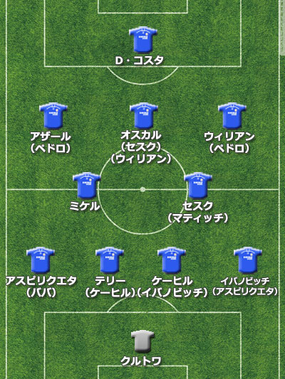 図はヒディンク体制での主なフォーメーション。そもそも選手のパフォーマンスが低調だったにもかかわらず、アザールやテリー、ブラニスラフ・イバノビッチ、ジエゴ・コスタらが度々負傷で離脱することが多く、ベストな布陣を組めない試合も多かった。