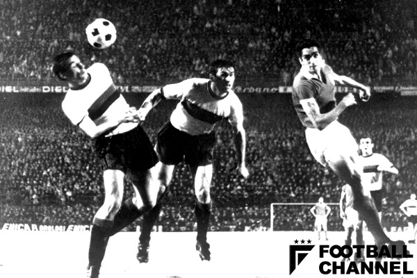 エレニオ・エレーラ監督が率いた1960年代のインテルは、かんぬきをかけるという意味の“カテナチオ”戦術で欧州タイトルを獲得した。写真は1965年、サン・シーロでベンフィカのストライカー、トーレスと競り合うインテルの守備陣【写真:Getty Images】