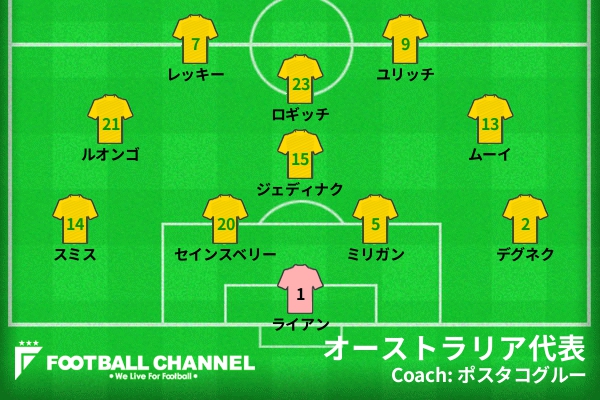 この試合のメンバーは、守護神マシュー・ライアン(バレンシア)。CBにはトレント・セインスベリー(江蘇蘇寧)とチーム随一のユーティリティで監督の信頼が厚いマーク・ミリガン(バニーヤス)。左SBは、スタメンの座を確保したブラッド・スミス(ボーンマス)。そして、相変わらず試合ごとの交替起用が続く右SBには、クロアチア生まれのセルビア人として経験したユーゴ内戦の難民として幼いころに移民としてやってきた、24歳のミロス・デグネク(1860ミュンヘン)が起用された。