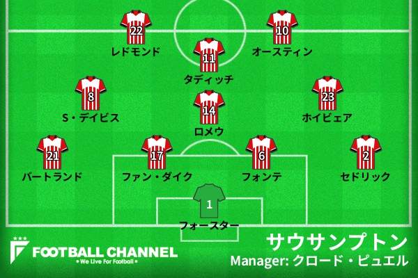 メンバーは基本的にウェストハム戦を踏襲することが予想される。最前線は開幕から6試合ゴールのないシェイン・ロングではなく、前節と同じくチャーリー・オースティンが務める。その周囲をネイサン・レドモンドがサポートし、アシスト能力と得点力を兼ね備えた好調のドゥシャン・タディッチが2人を操る。