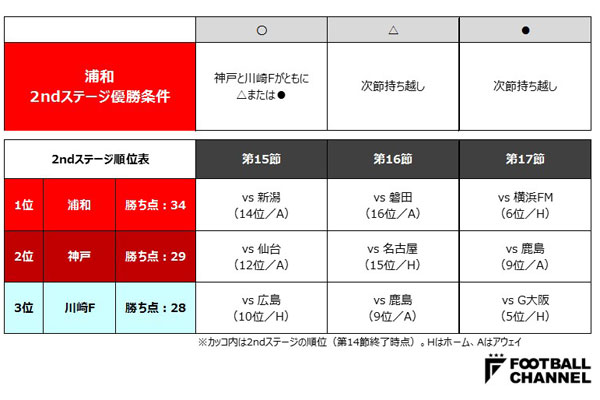 浦和(勝ち点34)が新潟に勝利し、2位のヴィッセル神戸(勝ち点29)と3位の川崎フロンターレ(勝ち点28)がともに引き分け以下に終わると2ndステージ優勝が決まる。