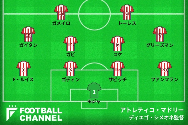 シメオネは68分にカラスコに代えてガメイロを投入。グリーズマンがカラスコに代わって右サイドに入り、コケ及び後半から一気にパフォーマンスを上げたガビの2ボランチに手を貸した。また存在感のなかった左サイドバックのフィリペも、ようやく前線へと駆け上がるようになり、その真価を発揮している。