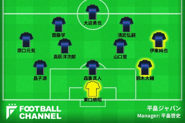 遠藤(保仁)さんの後にこういう遠藤さんっぽい選手がいないかなあと考えると、高萩選手が一人いると、面白くなるかなと思いました。あと、一回3バックをやってみたらどうなるのかなというのが、個人的にすごいあるんですよ。Jリーグでもすごい多いじゃないですか。ということで、平ちゃんジャパンはこんな感じです!