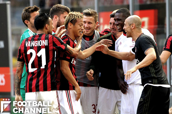 本田のFK弾に歓喜したミラン。全選手が作った輪。3年半の集大成で残した爪痕