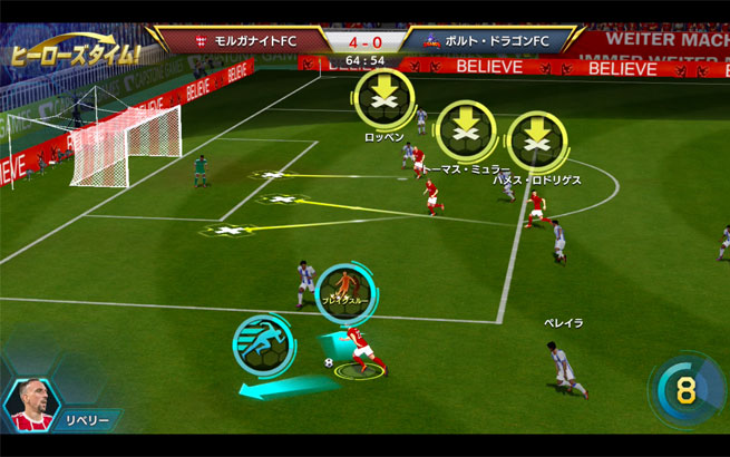 これまでのサッカーゲームと違うのは、常にプレーヤーに選択が迫られることだ。試合を動かす重要な局面ではパスやドリブルのコースを自らが選択し、シュートコースは指でなぞって指示することができる。