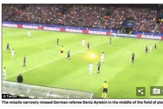 観客席から飛んできた発煙筒がピッチ中央に着弾【写真:デイリー・メールのスクリーンショット】