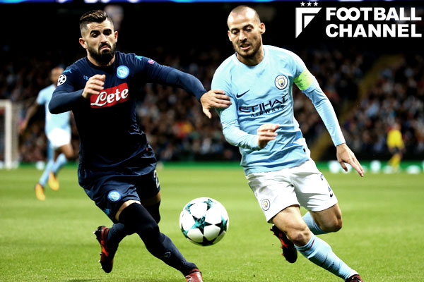 そうしてDFラインが押し下げられたところに、2列目から飛び出してくるインサイドMFがダビド・シルバやケビン・デ・ブルイネといった面々だから始末が悪い。パス交換の技術に長けると共に、それぞれがウイングでもやれるくらい速くボールを運べる。ピッチの大外で運んだボールを、ナポリ守備陣のギャップに飛び出した彼らが受ける。カバーが入っても簡単に外され、ボールはピッチの中央へ。