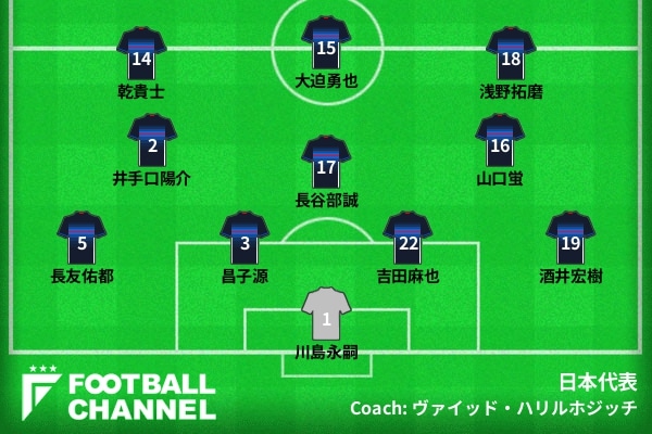 堅守速攻スタイルの典型が予選突破を決めたオーストラリア戦だ。MFには長谷部誠、井手口、山口のボールハンター3人。サイドには俊足の浅野拓磨と乾貴士。アグレッシブな守備でパスワークを寸断し、縦に速いカウンターを仕掛けている。