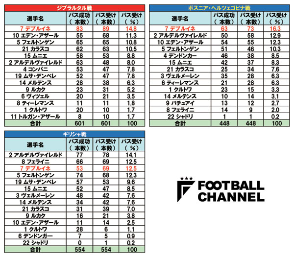 「ベルギーはブラジルと違って、中盤中央にいる選手へ積極的にボールを入れてきます。そこでプレーするデ・ブルイネがキーになっていて、ベルギーの直近4試合のうち彼が先発出場した3試合におけるパス受けのデータを見ますと、やはり数字が大きくなっています。