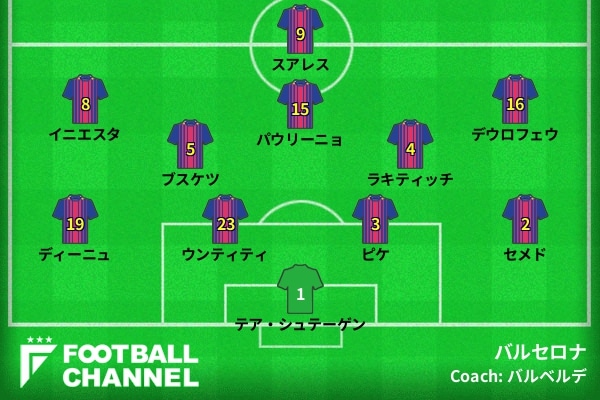 トップ下や右サイドハーフの導入により右サイドに人が多く集まることで、ポジションを1つ下げたラキティッチは、相手とのかみ合わせで常にフリーとなっていたアンカーのブスケツと共にビルドアップに貢献した。逆に左サイドで以前よりも大きなスペースを得たイニエスタは、相手の2列目と3列目の間にポジションをとる機会を増やしながら、ボールを受けては得意のドリブルで仕掛けどころとなっていた。