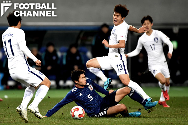 その後はしばらく守備のブロックを作る韓国に対して日本がサイドを起点に攻めようとするも、ボールを引っ掛けられてカウンターを受ける状況が繰り返された。チョン・ウヨンに逆転の直接FKを決められる前のシーンでは車屋がロングボールをヘディングで跳ね返したものの、そのボールをキム・ミヌに拾われ、そこを今野がマークしてミスパスを誘うところまでは守備が機能していた。