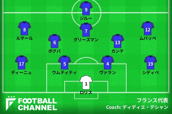 基本フォーメーションは、ジルーとグリーズマンを2トップ気味に置き、カンテとポグバが2ボランチを形成する4-2-3-1。あるいは、中盤にカンテ、ポグバ、マテュイディ、トリッソかラビオら新戦力を加えた三角形を敷いた4-3-3。この場合はポスト役のジルーを外して、攻撃陣はグリーズマンを真ん中に、サイドをムバッペ、コマン、デンベレ、ルマール、マルシャルらが固める布陣になる。