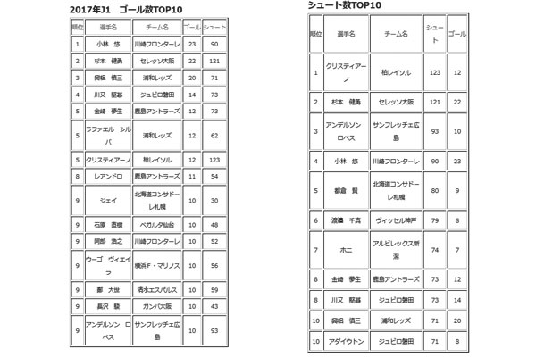 シュート数のランキングを見ると杉本は121本で2位だが、小林は90本、興梠に至っては71本にとどまっている。より多くのゴールを生み出した選手が、シュート数でも上位を独占しているわけではないということがわかる。