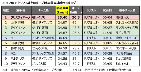 2017シーズンの明治安田生命J1リーグにおける、ドリブルまたはキープ時の最高速度ランキングが上の表だ。アルビレックス新潟のホニ、ジュビロ磐田のアダイウトン、横浜F・マリノスの山中亮輔は、それぞれ2回ずつランクインしている。いずれのクラブも当時は堅守速攻が武器の一つとなっていた。対峙する相手に怯まず加速し、スピードや馬力を活かしてのキープなど、彼らの長所はチームの拠り所になっていた。