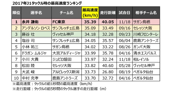そして、上位2名は永井謙佑、アンデルソン・ロペスとなった。いずれもアタッカーで、共に最高速度35km/hを越えた。J最高レベルのスピードを持つ永井は労を惜しまない選手でもあり、守備面でも力を発揮する。