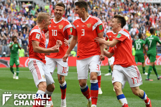 ロシアは最後までサウジアラビアにゴールを許さず。終了間際にはチェリシェフが技ありのアウトサイド弾でこの日2点目を決めて4-0。さらにゴロビンがFKを直接決めて5-0となり、開催国が勝ち点3を手にした。