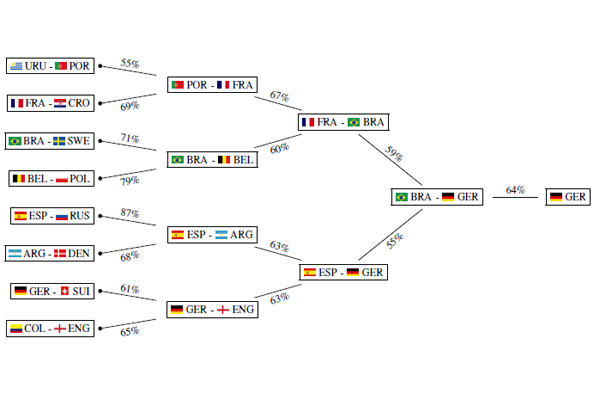 教授らの予測ではロシアW杯で優勝の可能性が最も高いのはスペイン。そしてドイツ、ブラジル、フランス、ベルギーが続いた。しかし、決勝トーナメントでの対戦順序までを考慮に入れると結果が変わる。優勝国はドイツになるとはじき出された。