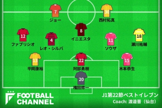 フットボールチャンネル編集部が選んだ明治安田生命J1リーグ第22節のベストイレブンと最優秀監督は以下のとおり。