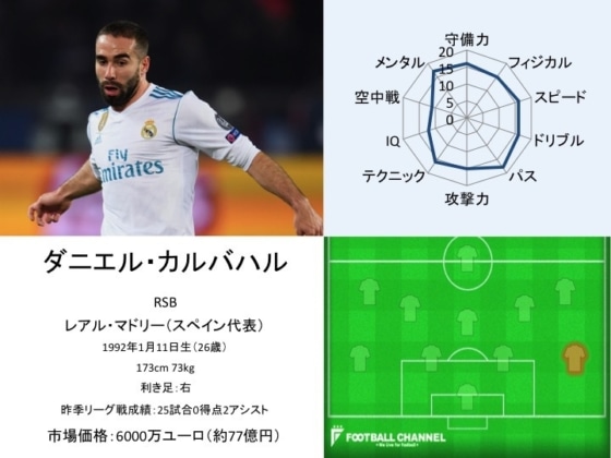 17/18シーズンのチャンピオンズリーグ決勝で怪我による途中交代を余儀なくされた際に見せた涙が印象的なSB。攻撃参加も果敢に行うが、年々守備力も向上してきている点は大いに評価できる。26歳という若さながらレアル・マドリーの右サイドバックとして確固たる地位を築いている辺りはメンタルの強さが伺える。