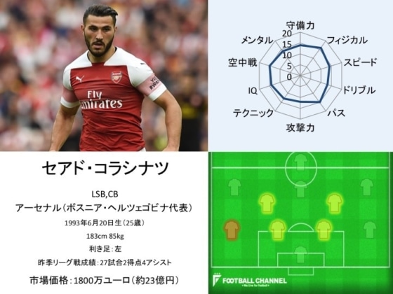 ディフェンスはもちろん、攻撃面でも絶大な存在感を発揮するボスニア・ヘルツェゴビナ代表のセアド・コラシナツ。SBを主戦場としているが、ボランチやCBなどでもプレーすることが可能である。身長183cmながら体重は85kgとフィジカルの強さは世界でも屈指。隙を見た攻め上がりでサイドを疾走するその姿は、まさに重戦車だ。