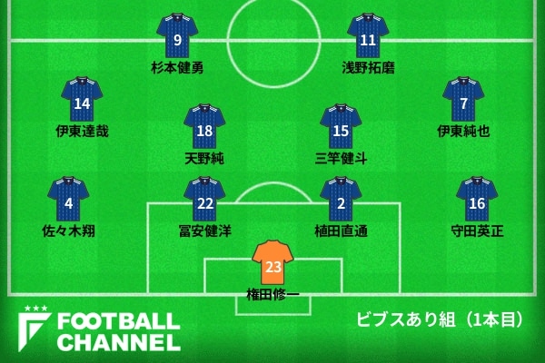 そうしたビブスあり組のアピールも目立った1本目から、2本目は遠藤が右サイドバックにポジションを移し、ビブスあり組の右サイドバックから守田がビブスなし組に入り、青山とボランチを組んだ。さらに佐々木、浅野、伊東がビブスなし組に移り、2トップに入った浅野に代わり、南野は左サイドハーフに配置された。一方のビブスあり組では堂安が杉本と縦の2トップを組み、中島が右サイドハーフに入る、ややオプション的な組み合わせがテストされた。なおビブスあり組のGKはシュミット・ダニエルに代わっている。