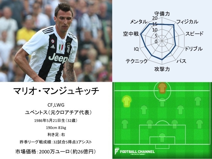 ロシアワールドカップでクロアチア代表の準優勝に貢献した長身FW。守備にも尽力的であり、ポストプレーの上手さも光る。ユベントスでは、本職のCF以外にもウィングとして出場することも多い。マンジュキッチが同ポジションでプレーすることにより、相手SBとの身長差を活かしてサイドで起点を作ることが可能になる。戦術面でも多大な貢献度を誇っていると言えるだろう。