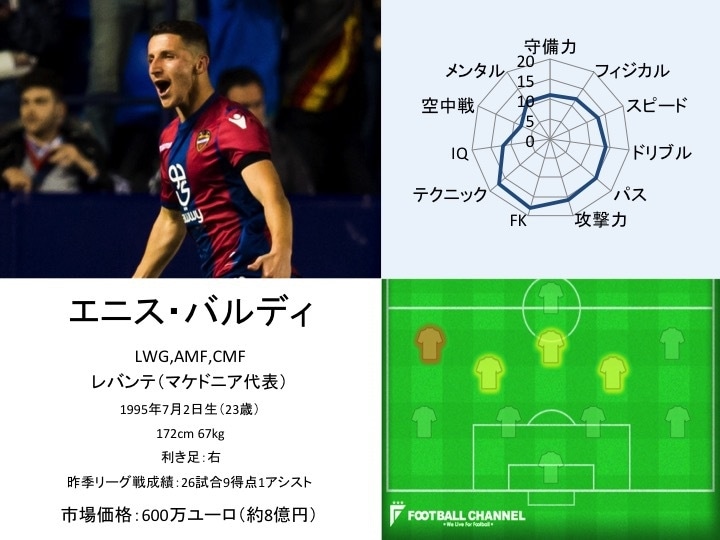 恐らく、日本人のほとんどがこの選手の名を耳にしたことはないかもしれない。大舞台に立ったことはほとんどなく、圧倒的な活躍をみせているわけでもないため、それも無理はない。ただ、FKの質だけで言えばあのリオネル・メッシにも匹敵するレベルであることも、紛れもない事実だ。昨季はリーグ戦全9ゴールのうち5ゴールを直接FKから奪うなど、目に見える結果をしっかり残している。レバンテの試合を見る機会があれば、ぜひバルディに注目していただきたい。