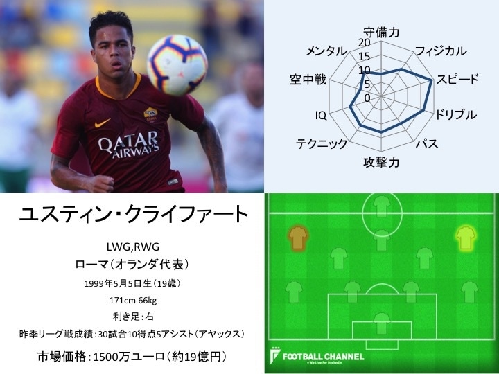 父にオランダの英雄・パトリックを持つオランダの新たなエース候補こそ、ユスティン・クライファートである。偉大な父は典型的なストライカーだったが、息子・ユスティンはスピードに乗ったドリブルを得意とするサイドアタッカーだ。