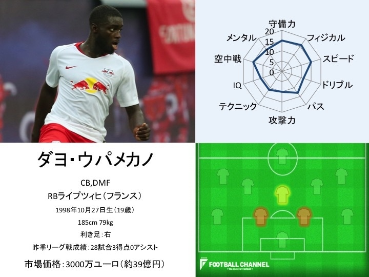 19歳にしてライプツィヒの守備の要となっているフランス出身のCB。強さ、上手さ、速さのすべてを兼ね備えており、それに加え足下の技術もしっかりしているなど、すでに持っているポテンシャルはワールドクラスだ。