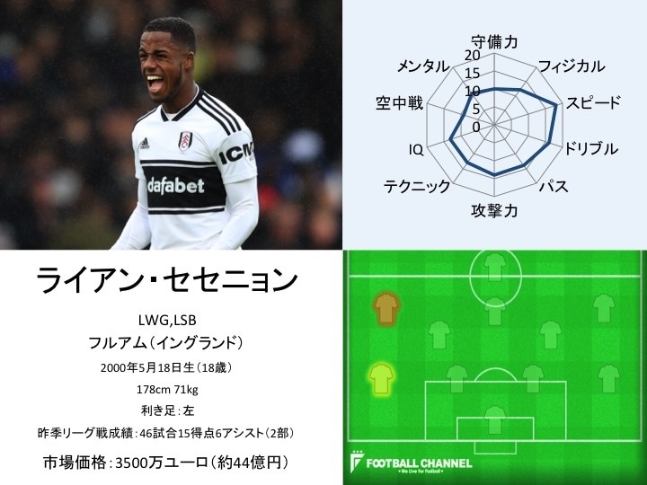 昨季のフルアムで15得点6アシストを記録し、一気に名を馳せたイングランド生まれのDF。まだ18歳ながら、市場価格は3500万ユーロ(約44億円)となっているなど、数々のビッグクラブが注目を集める逸材だ。