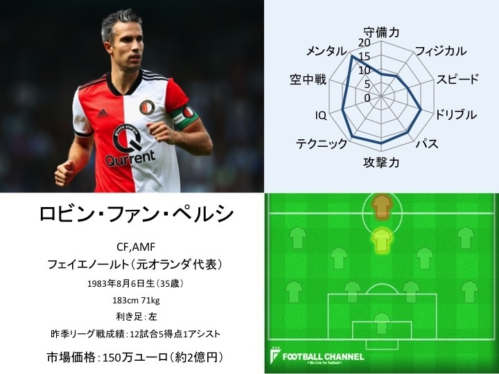 フェイエノールトでプロデビューを果たし、アーセナルで世界的なCFとなるまでに成長した元オランダ代表FW。左足から放たれる強烈なシュートが最大の持ち味であり、確実にゴールへ仕留められる決定力の高さも際立つ。また、ロングボールにピッタリと合わせられるダイナミックなボレーシュートも同選手の魅力だ。