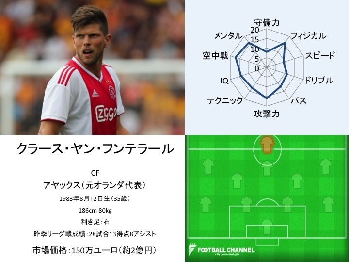 母国・オランダのヘーレンフェーンやアヤックスで活躍し、その後レアル・マドリーやミランなどといったビッグクラブに在籍した経験を持つストライカー。ペナルティエリア内で発揮するレベルの高いテクニックは今も衰えておらず、ゴールへの意慾も相変わらず強い。