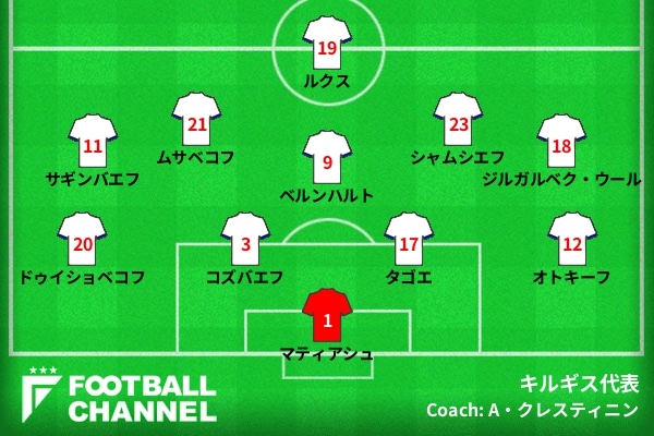 一方でキルギスの攻撃はカウンターがメインになるはず。エースストライカーのミルラン・ムルザエフが不在なのは痛いが、その中でもベルンハルトやイスライロフといった得点力のある選手の中盤からの飛び出しや、ボールと逆サイドのウィンガーのクロスへの飛び込みは警戒すべきだ。