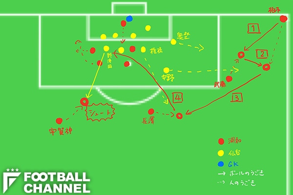 また、フリーの長澤にボールが出たことで、3人目の椎橋慧也がペナルティエリアから引き出された。柏木は「ショートをしたことでセカンド(こぼれ球狙い)の選手がこっちに引っ張られた」と、3人目が外に出てきたことも認識していた。この時点で浦和の選手はゴール前に興梠慎三、阿部勇樹、橋岡大樹、槙野智章、岩波拓也の5人、仙台の選手は7人+GKとなる。
