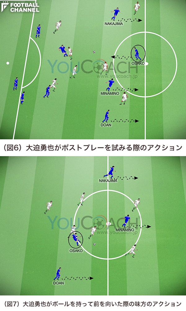 (図5)大迫勇也のポストプレーから2列目のアタッカーたちが絡む日本代表の崩し【画像:YouCoach】