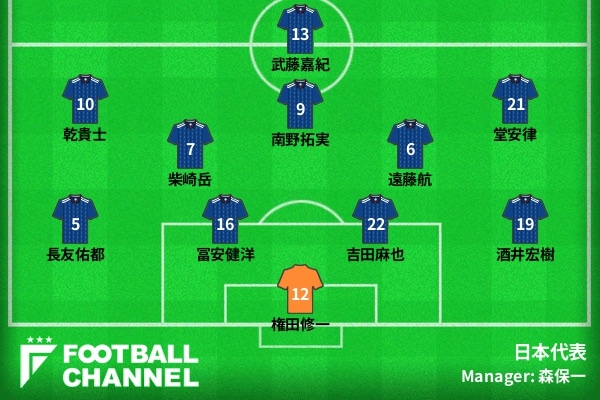 序盤からボールを握り、楔のパスを前に送るも潰されてしまう。日本が攻めあぐねる中、逆にトルクメニスタンのカウンターを浴びてしまう。柴崎岳、冨安健洋の即席ボランチコンビがリスクマネジメントしきれず、スピードアップを許した。最終ラインも、斜めに走り込んでくる相手に苦労した。すると26分、遠目から強烈なシュートを食らってビハインドを背負うことに。