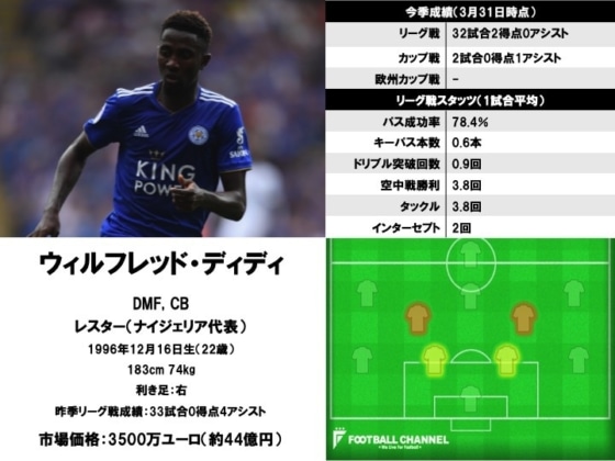 レスター所属3年目を迎えた守備的MF。ボール奪取の上手さに長け、鋭く的確なタックルも同選手の特長だ。まだ22歳と若いが、昨年行われたロシアワールドカップにナイジェリア代表として出場するなど、持っているポテンシャルは非常に高い。近く、ビッグクラブ移籍を果たしてもおかしくはないだろう。3月はリーグ戦4試合に出場。得点やアシストはなかったが、データサイト『Who Scored』内では同4試合中3試合で7点以上のレーティングが与えられているなど、申し分ない活躍を見せていた。チームも現在リーグ戦4連勝中と調子が良い。