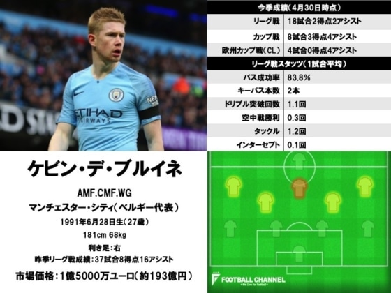 マンチェスター・シティで活躍する世界屈指のMF。正確無比なスルーパスと効果的なクロス、強烈なミドルシュートを武器にゴールに直結するプレーを連発できる存在であり、選手層の厚いシティにおいても貴重な戦力となっている。昨年行われたロシアワールドカップではベルギー代表の3位に大きく貢献している。
